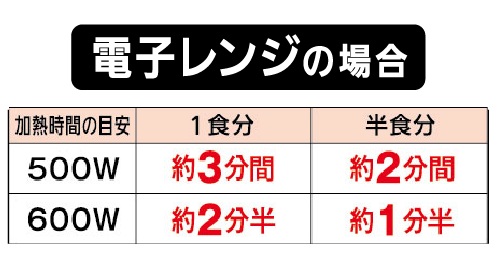 凍ったままのめんを内袋のまま皿の上にのせ、電子レンジで加熱します。(半食分の場合は、半食分だけ取り出し皿の上にのせ、ラップをかけて加熱してください。)