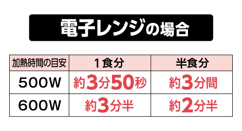 凍ったままのめんを内袋のまま皿の上にのせ、電子レンジで加熱します。(半食分の場合は、半食分だけ取り出し皿の上にのせ、ラップをかけて加熱してください。)