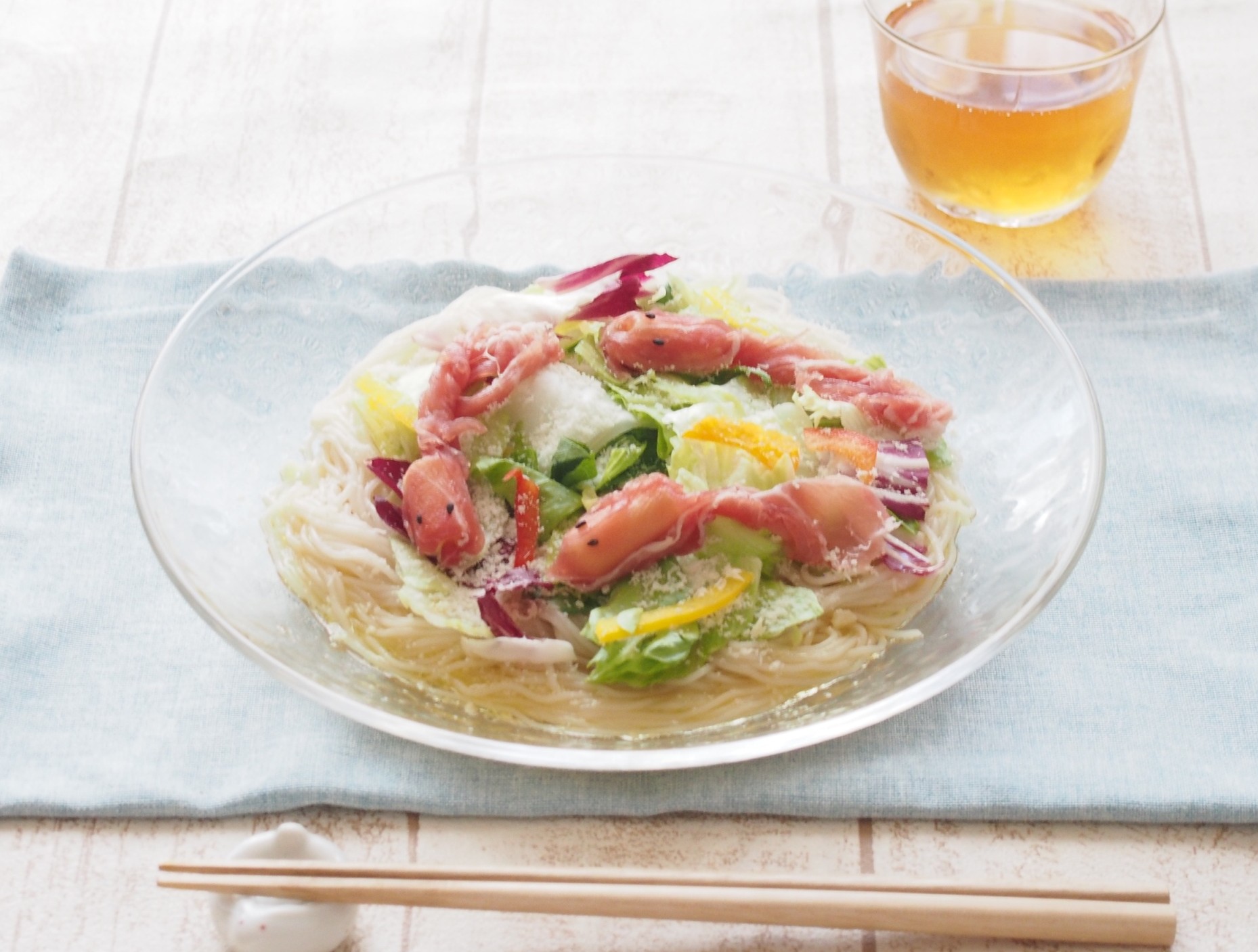 - 「流水麺」国産小麦粉使用 うどんを水でほぐし、ざるでよく水切りして器に盛ります。