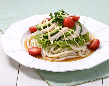 - 器にうどんを盛り、Aを彩りよく盛り付けます。